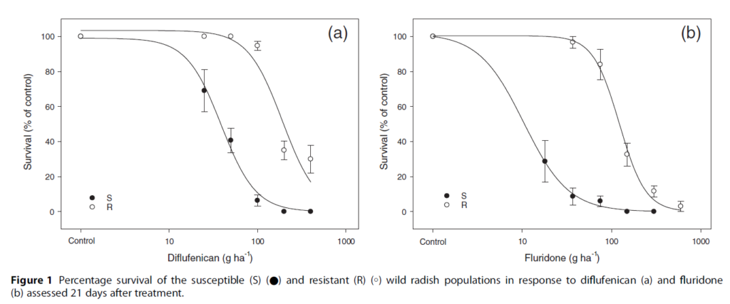 Table 1: Lethal dose to control 50% of the population (LD50) of susceptible compared to resistant wild radish populations for the herbicides diflufenican and fluridone.