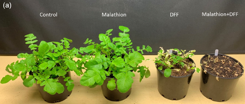 To determine if P450 enzymes were at play, Huan Lu used the P450 inhibitor malathion. Malathion is an insecticide that can ‘turn off’ some P450 enzymes. Wild radish was pre-treated with 1000 g/ha of Malathion just before spraying diflufenican and hey presto, all of the wild radish died as can be seen in the photo below. Malathion studies are a good way of determining if P450 metabolic resistance is at play but these studies are not always conclusive. For this reason, we can only say that P450 enzymes are likely the cause of this resistance.