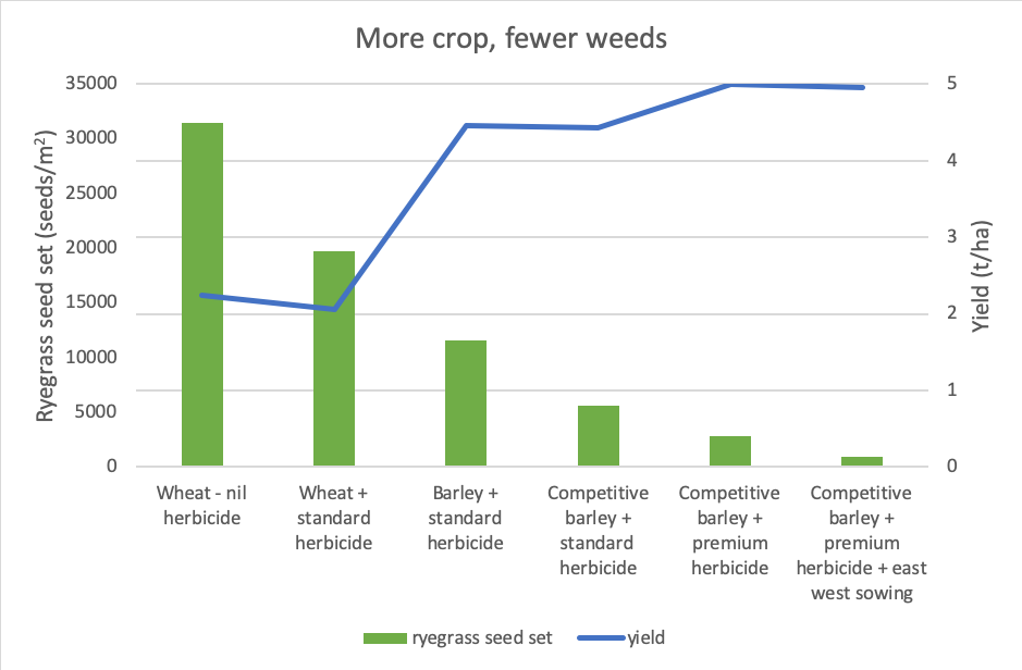 Switching crop types from wheat to barley with the same herbicide brew further reduced ryegrass seed set potential by 42% and doubled the yield in this trial. Just by switching from wheat to barley!  This is purely because barley is more competitive than wheat. Pretty simple to adopt and profitable too given that barley nearly doubled the yield of wheat.
