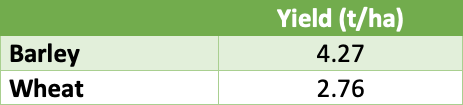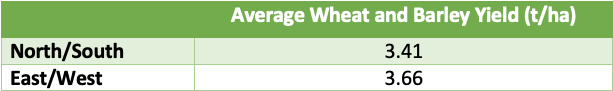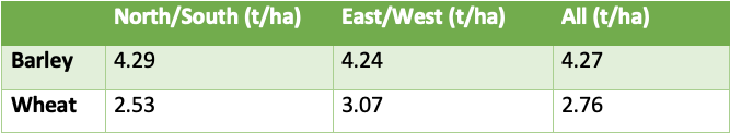 There was essentially no difference in yield in the barley between N/S and E/W sowing, and this is consistent with past research.  However, the wheat sown E/W yielded about 0.5t/ha more than wheat sown N/S. This is likely due to the wheat having less competitive ability than barley and therefore benefiting from the extra competition that E/W sowing offers.