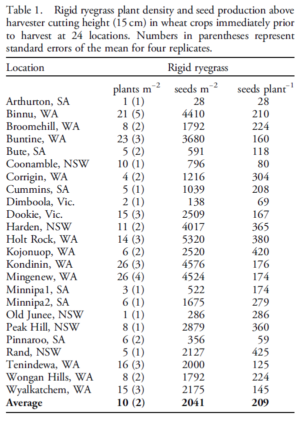 This is a bit of a ‘how long is a piece of string’ type question. However, this research gave us a fairly definitive answer. On average across 24 sites, annual ryegrass in Australia set 209 seeds per plant in wheat crops. The range was from as low as 28 seeds/plant to as high as 425 seeds/plant depending on rainfall, ryegrass density, and crop competition.