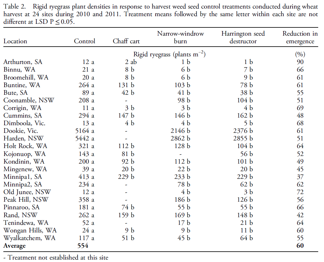 All of that effort, thousands of miles of travel, 24 sites, more than 50 Steak Dianne and Chips meals (or Chicken Parmi), only to find that all of the harvest weed seed control tools performed equally. They each reduced the subsequent ryegrass germination by 60%.