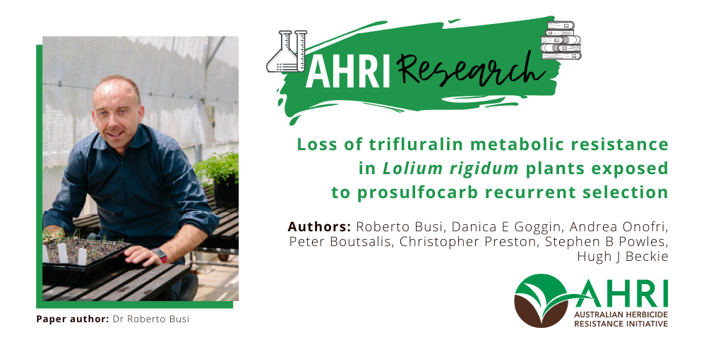 This study provides evidence that trait(s) enabling efficient trifluralin metabolism in L. rigidum are purged from the population under prosulfocarb recurrent selection. The level of trifluralin metabolism in vitro and its inhibition caused by phorate action on trifluralin‐metabolizing enzyme(s) is equivalent to the effect produced by prosulfocarb selection. The hypothetical link between the two phenomena is that the putative monooxygenase(s) conferring trifluralin metabolic resistance also mediate the activation of prosulfocarb to its toxic sulfoxide. Thus, we speculate that survival to prosulfocarb via a lack of metabolic herbicide activation, and survival to trifluralin conferred by enhanced herbicide metabolism, are mutually exclusive. These findings not only open up a new research direction in terms of the interaction between different herbicide resistance mechanisms in L. rigidum , but also offer strategies for immediate management of the population dynamics of metabolism‐based resistance in the field.