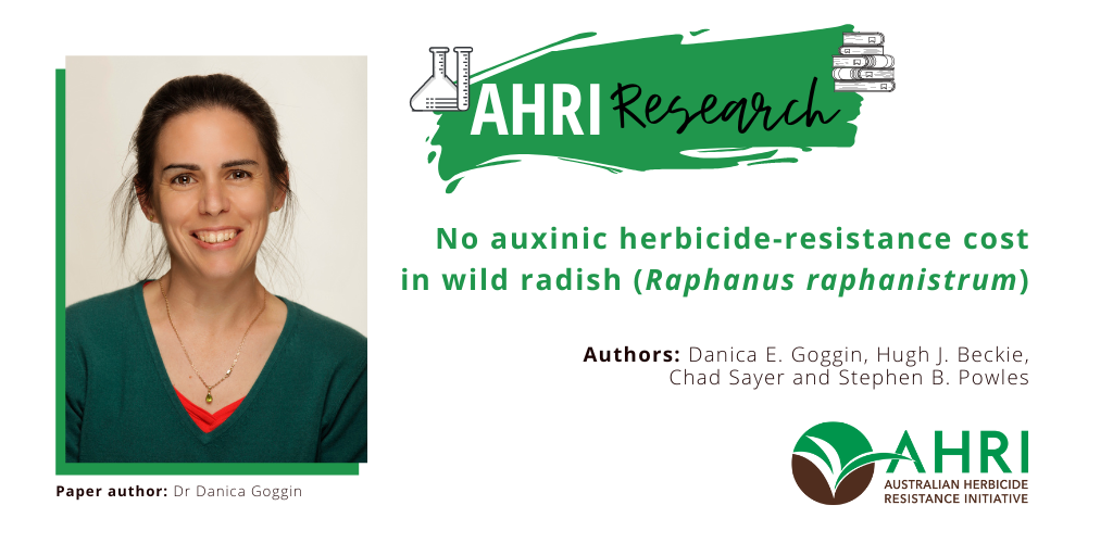 In this study, Danica Goggin used 11 very well characterised resistant wild radish populations and two susceptible populations grown in the presence and absence of competition from wheat so as to examine for any auxinic herbicide resistance fitness cost. She found no evidence of a fitness cost. The two susceptible and 11 resistant populations were equally suppressed by wheat competition, with growth and seed production equally reduced by competition. Thus, across these 11 resistant populations that had all been earlier studied at the mechanistic level (Goggin et al 2018), there was no evidence of a fitness cost associated with auxinic herbicide resistance.