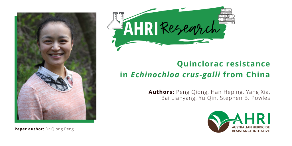 Over the past decade, there has been a productive collaboration between AHRI and Chinese researchers. Scholarships from the China Scholarship Council have enabled young Chinese university assistant Professors (Lecturers) to come to AHRI each for one year to work principally with AHRI researchers Drs Yu Qin and Heping Han. Dr Qiong Peng came to AHRI for one year to study Chinese Echinochloa populations resistant to the rice-selective auxinic herbicide quinclorac. This paper documents two Echinochloa populations as being very highly resistant to quinclorac. She found that quinclorac resistance in these Echinochloa populations is not due to differential quinclorac uptake, translocation or metabolism. Anyone who works on the mechanistic basis of auxinic herbicide resistance knows that this is a very difficult research area, given the cascade of changes that auxinic herbicides cause in plants. Further molecular work is required to identify the mechanistic basis of quinclorac resistance.