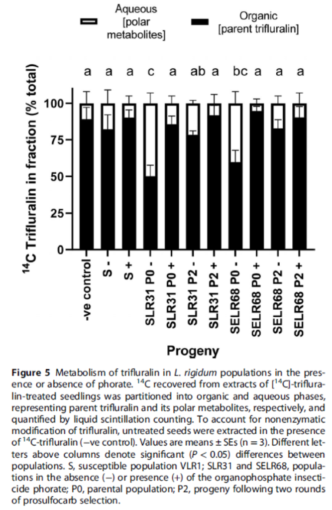 One of the main mechanisms of trifluralin resistance is metabolism based resistance by P450 enzymes. We know this because when researchers use a P450 inhibitor such as phorate, they can switch off the resistance. That is exactly what Roberto and Danica did in this study. For example, for the SELR68-P0 population, pre-treating the ryegrass seeds with phorate reduced trifluralin survival from 41% to 4%. Turning off the P450’s with phorate turned off the resistance.