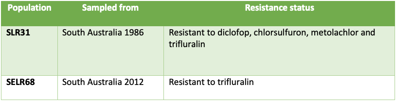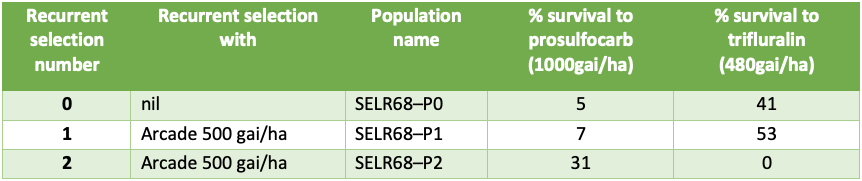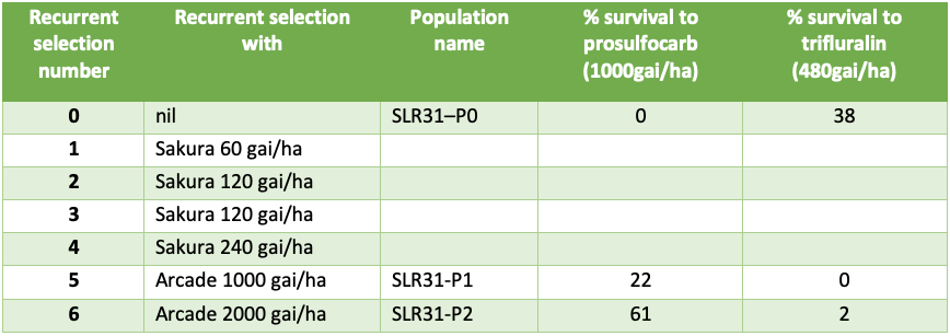 SLR31 was selected with Sakura (pyroxasulfone) four times then twice with Arcade (prosulfocarb). These six rounds of recurrent selection resulted in 61% resistance to prosulfocarb at 1000 gai/ha. At the same time, trifluralin resistance dropped from 45% to 0 – 2%.